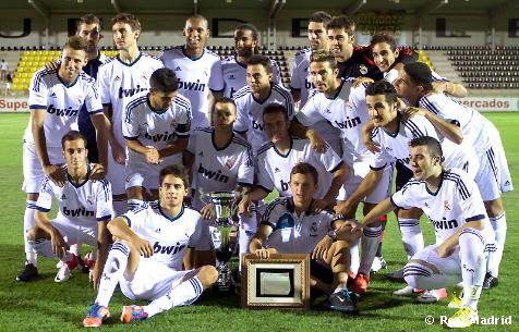 | Los jugadores del Castilla posando con el trofeo ganado fotografía de realmadrid.com |