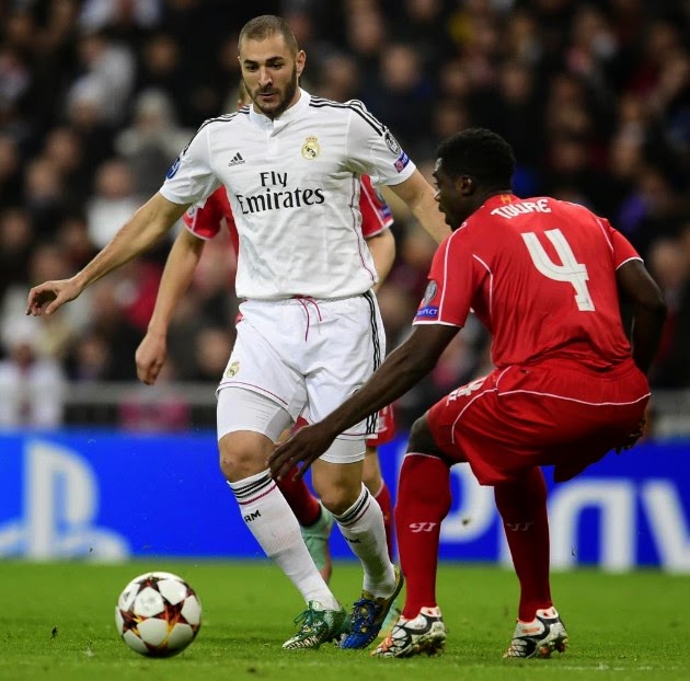 En el minuto 28 el dominio del Madrid iba a tener por fin su premio. Jugada del ataque blanco con pase de Cristiano a Isco, éste abre a banda para Marcelo que mete un balón al segundo palo por donde entra Benzema que la empuja al fondo de la portería. Pudo llegar el segundo en el 35 en una falta directa que ejecutó Cristiano con potencia y Mignolet despejó como pudo. En la siguiente jugada una bonita combinación entre Varane y Benzema la salva en ultima instancia Touré.