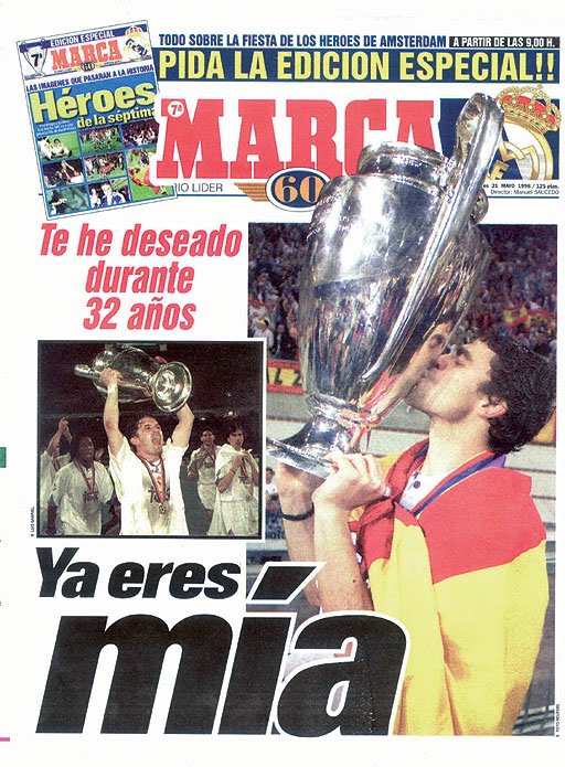Hoy hace 12 años, que los madridistas volvimos a sentir el éxtasis de ganar una Copa de Europa. Fue muy especial, sobre todo para los madridistas de una generación que no le habíamos visto a nuestro equipo ganar el máximo trofeo europeo. Yo, como muchos de los que se que leéis este blog, pudimos vivirlo en directo en el Ámsterdam Arena, y os puedo asegurar que fue algo indescriptible. Desde luego, que la 8ª y la 9ª también fue un subidón enorme, pero lo de la 7ª, fue muy especial. ¡VOLVEREMOS!.