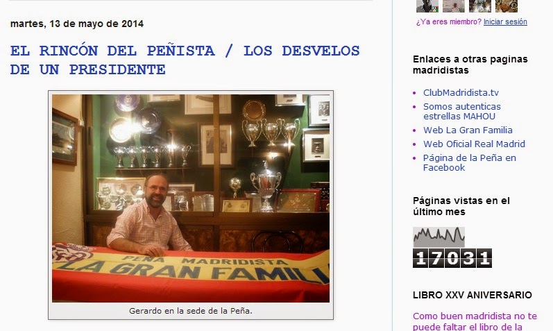 Pero también os estáis haciendo habituales muchos seguidores que sin ser socios de la Peña, os sentís interesados por el trabajo de Antonio, esto para mi tiene un valor incalculable, poder llegar a tantos aficionados y a tantos lugares del mundo, pudiendo ratificar en las estadísticas desde donde nos seguís, siendo un orgullo para el presidente de esta humilde Peña madridista.