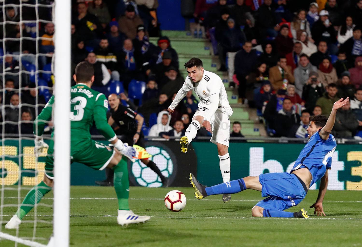 Del fútbol monótono del primer acto, habíamos pasado a un fútbol rápido, a la par de igual de poco efectivo. Como en el comienzo del partido, la primera ocasión de esta segunda mitad iba a ser madridista, esta vez en botas de Brahim que la cruzó en exceso ante Soria. Poco después y en un disparo lejano era Casemiro quien obligaba al portero del Getafe a una buena parada. Y otra más a disparo de Carvajal. Gracias al portero azulón el Madrid no había tomado ventaja en estos primeros minutos del segundo acto.