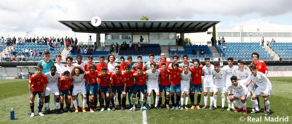 «En la imagen, Los jugadores del Cadete B del Real Madrid y los de la Selección Española Sub15. Fotografía Real Madrid.com»