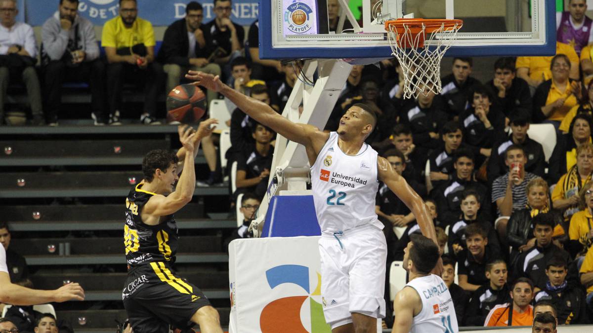 «En la imagen, Tavares lanza a canasta ante la oposición de un rival. Fotografía Realmadrid.com»