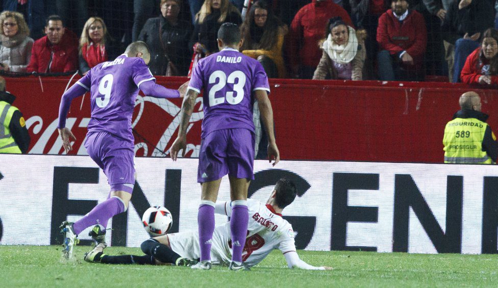 No se llevaba un minuto de juego cuando ya Escudero obligaba a Casillas a despejar el cuero que buscaba el fondo de la meta madridista. Poco después era Correa el que ponia a prueba al meta merengue. El Sevilla iba como un tiro y el Madrid de momento se defendía como podía. Pero curiosamente no sería ningún jugador sevillista el que iba a superar al portero del Madrid, sino un compañero. Era el minuto 10 cuando un buen centro de Sarabia era cabeceado por Danilo al fondo de su portería. Jugada desgraciada por parte del lateral brasileño.