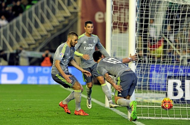 En el minuto 70 pudo llegar el empate gracias a nuestros dos laterales. Marcelo pone un estupendo pase largo a la otra banda por donde entra Carvajal, que tras controlar bien dentro del área la cruza demasiado. Y en la siguiente jugada, llegaba el empate. Genial pase filtrado por entre los defensores verdiblancos de Kroos para James, el colombiano recibe en fuera de juego y la pasa para que Benzema la empuje al fondo de las redes de la meta defendida por Adán.