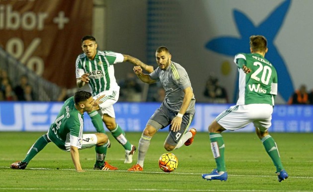 Benzema se marcha entre tres jugadores béticos.