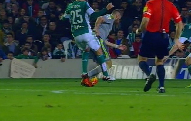 Benzema es objeto de un penalti que el colegiado, muy encima de la jugada no señaló.
