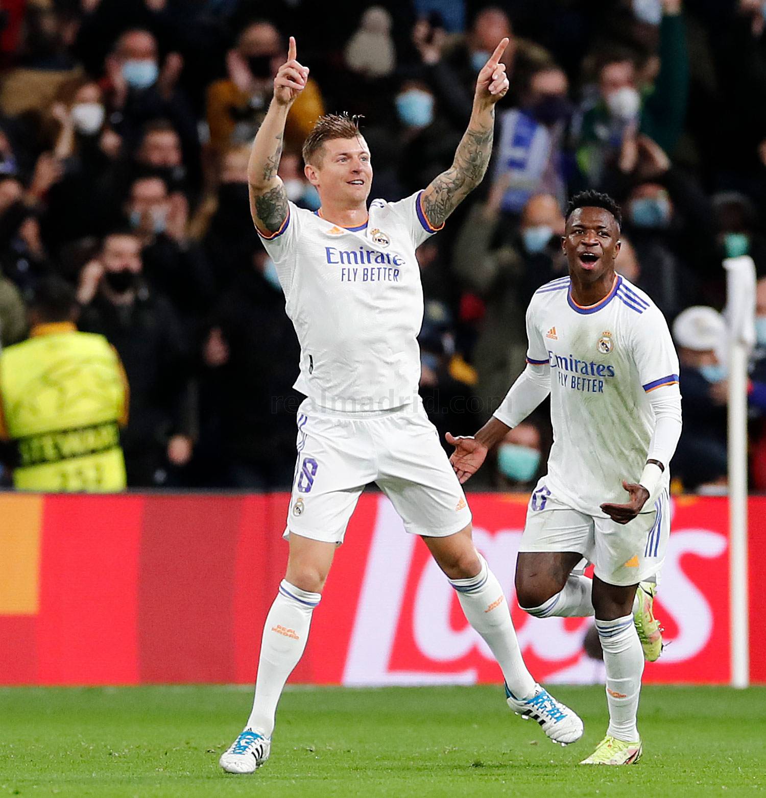 El factor Champions, es aquello que transforma al madridismo, aquello que hace a la afición llegar al estadio como si continuara la competición del año pasado. Y esto justamente es lo que contagia a Carvajal, que tras una temporada con más sombras que luces, consigue renacer para estar a la altura en el día que tocaba. De él nace la jugada del primer gol, con un pase al área, donde Vinicius consigue llegar al balón y Benzemà, tras rechace de Kepa, empujar a la red el primero de la noche. Al igual que Carvajal, el francés ha conseguido llegar en su mejor momento del curso, tras el mundial, con su preparación particular y dejando atrás las lesiones.