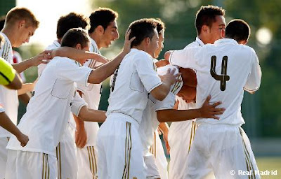 Los jugadores del Juvenil B celebrando uno de sus goles al Atlético fotografía realmadrid.com |