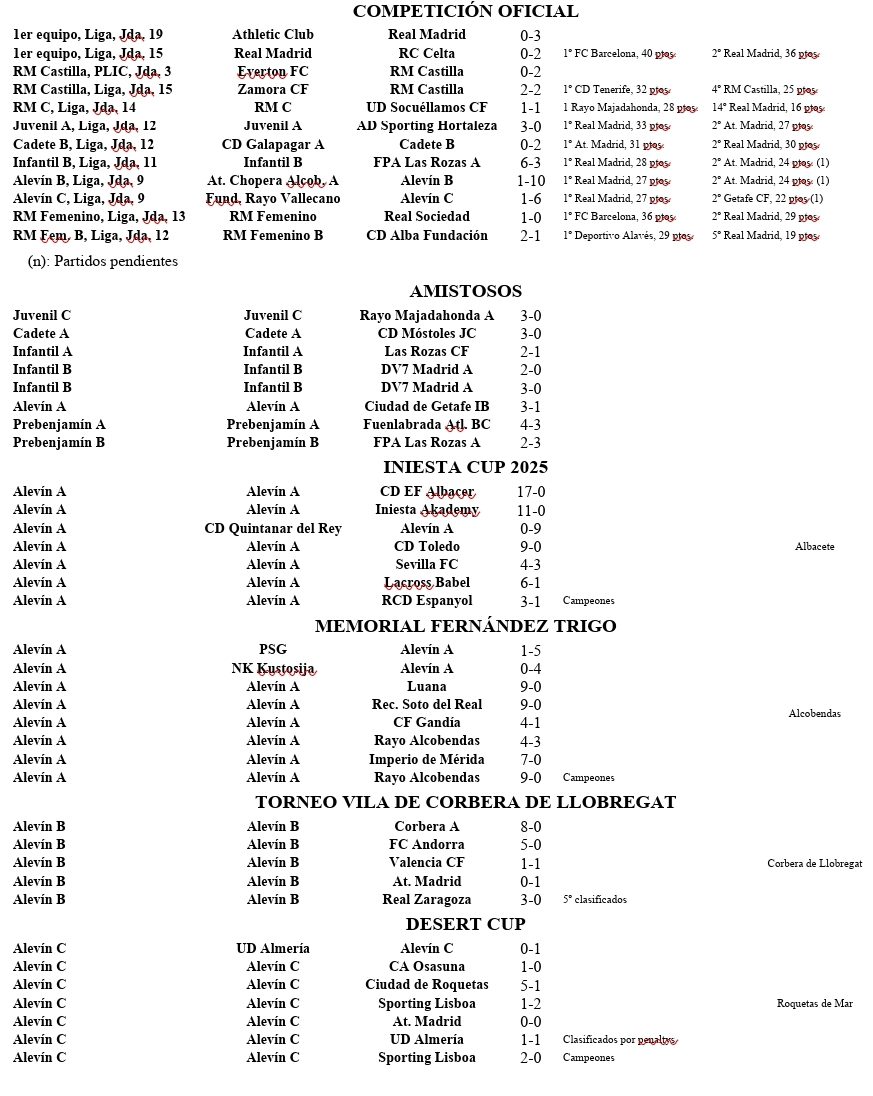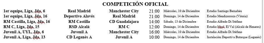 Os traemos los resultados y horarios de los próximos partidos de nuestros equipos, destacando los del Real Madrid Femenino en todas sus categorías, así como los de la cantera masculina, desde el Real Madrid Castilla al Prebenjamín.
