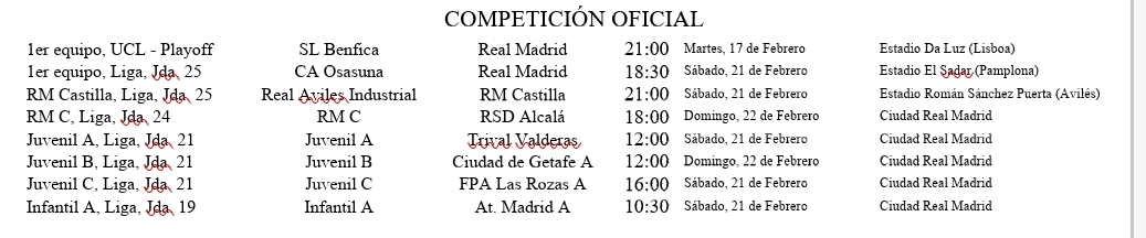 Os traemos los últimos resultados y horarios de los próximos partidos de todos nuestros equipos, destacando los del Real Madrid Femenino en todas sus categorías, así como los de la cantera masculina, desde el Real Madrid Castilla al Prebenjamín.