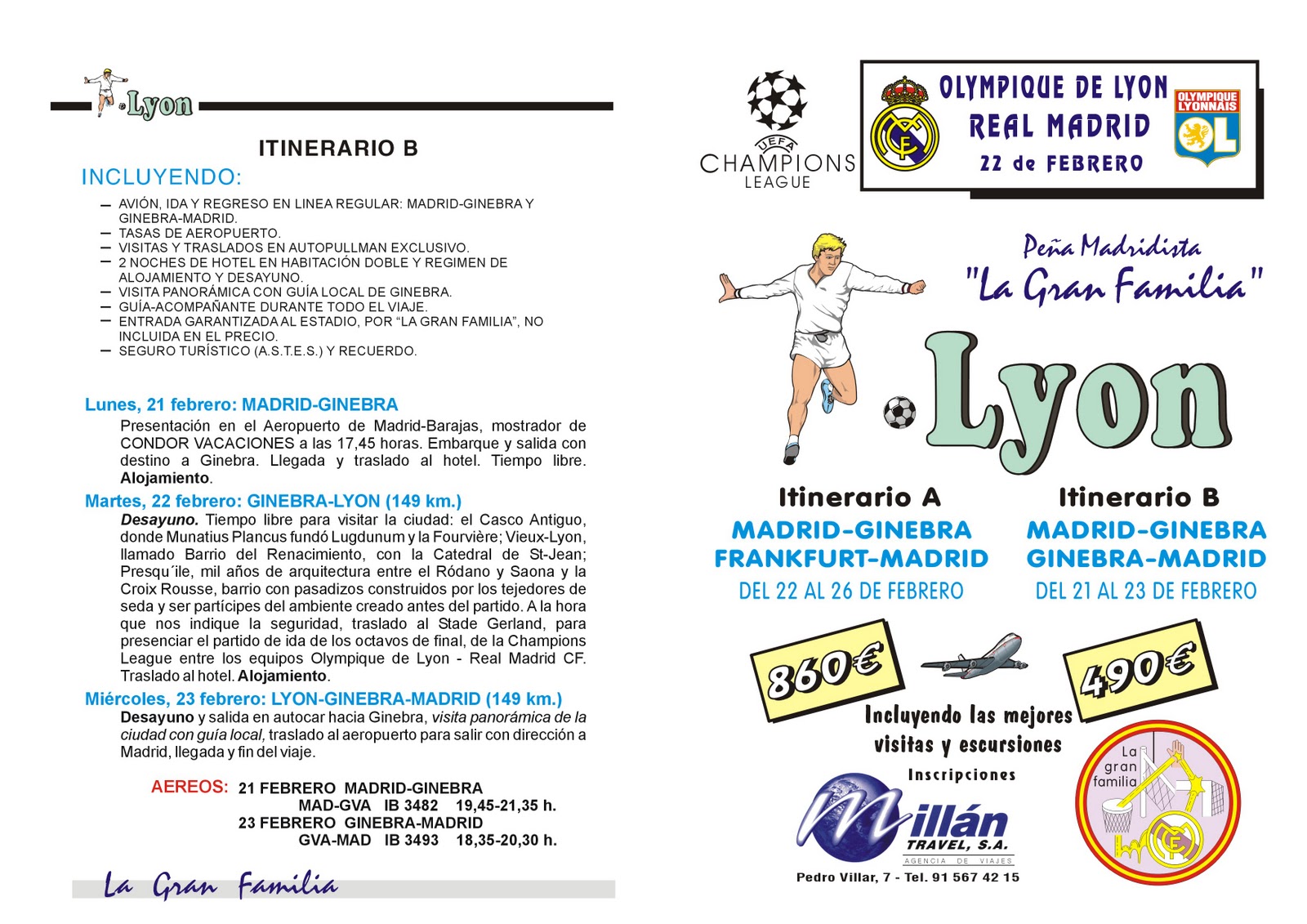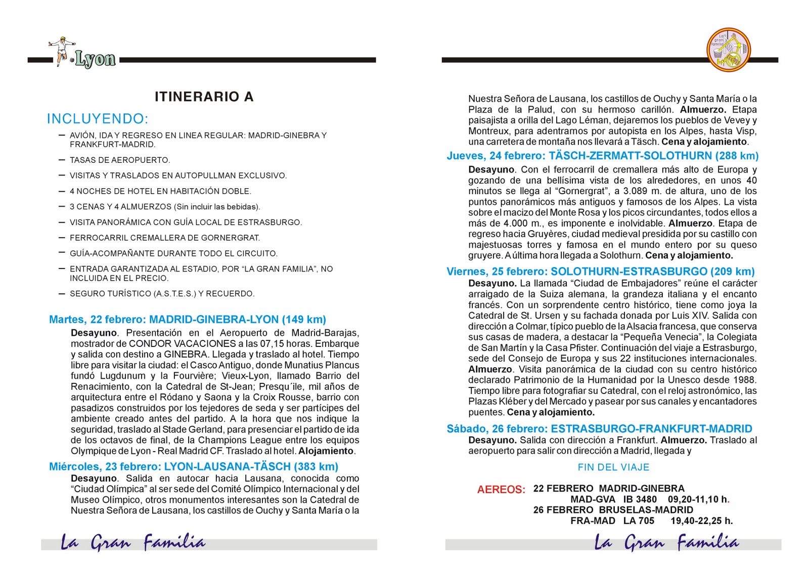 Ante todo desearte un Feliz Año 2011, que la ilusión se mantenga viva para poder afrontar todas las dificultades que nos vamos encontrando. Después del tremendo éxito de los desplazamientos que organizamos en la primera fase de la Champion League, donde a la vez acompañaron los resultados deportivos, nos disponemos a organizar el viaje, para acompañar al equipo a Lyon, de complicado recuerdo en ocasiones precedentes y del que “nos vamos a sacar la espina” en la presente edición. Hemos creado dos itinerarios intentando cubrir las necesidades de todos los socios, el itinerario A, llega a la Estación de Esquí más elitista de los Alpes, Zermatt, situada a los pies del Cervino, hace posible con su tren cremallera, fotografiar esta mítica cima y la posibilidad de seguir subiendo con los telecabinas. Además vamos a conocer pueblos tan entrañables como: Gruyéres, Solothurn o Colmar, y disfrutar de Estrasburgo, en donde se unen pasado, presente y futuro. Quiero ofreceros la posibilidad de participar en todas nuestras actividades, además de los viajes, seguimos con el apadrinamiento de nuestros ahijados, la confección del Christma y el Calendario de Liga, las comidas de Navidad y Socios, la página Web y el Blog, siempre puedes colaborar en algo y mantener viva nuestra amistad. Esperando veros involucrados en alguna de nuestras actividades y deseando lo mejor para nuestro equipo, se despide vuestro amigo.