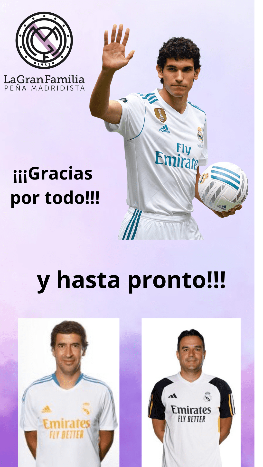 En ésta ocasión decimos ¡hasta luego! a un jugador que no ha tenido mucha suerte en su paso por el club, pero que nunca ha dado un problema y qué podemos decir que ha sido un placer tenerle entre nosotros. Me refiero a Jesús Vallejo. Por otro lado, decimos ¡hasta luego! a dos ex jugadores, que ahora se marchan del club tras haber cumplido sus etapas como entrenadores del Real Madrid Castilla y Real Madrid Femenino. Me refiero a Raúl González Blanco y Alberto Toril.