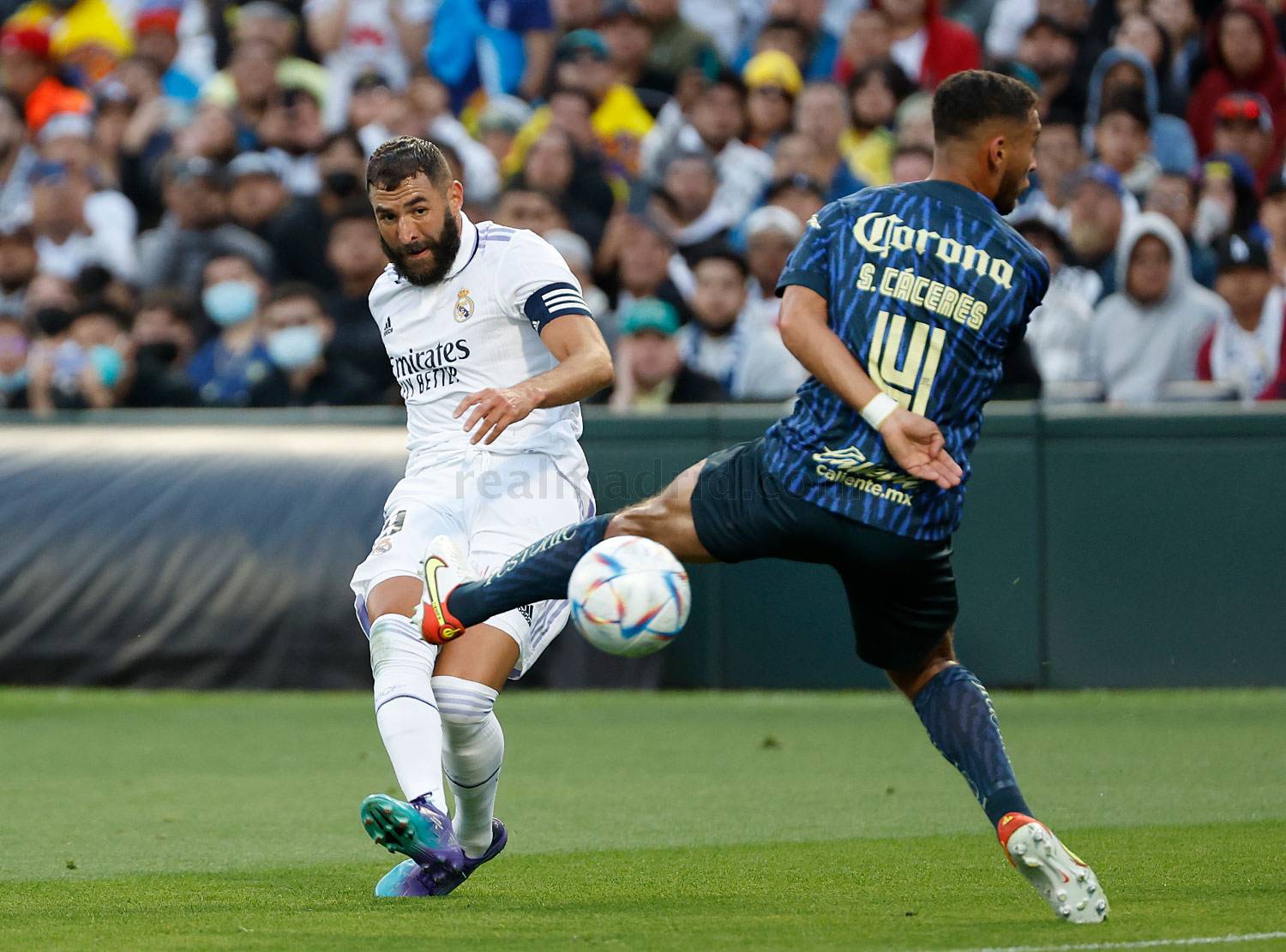El Madrid apretaba y pudo llegar el segundo en una combinación entre Vini y Karim, pero parece que al próximo Balón de Oro le está costando arrancar en esta temporada. No habíamos llegado a la media hora del encuentro y la superioridad merengue era absoluta. Pudo llegar el 0-2 en una eléctrica contra que inicia Valverde con pase a Benzema, Karim devuelve a Fede y este a Vini que saca un disparo que se marcha por poco. En este tiempo los españolistas se defendían como podían e intentaban hacer daño a la contra.
