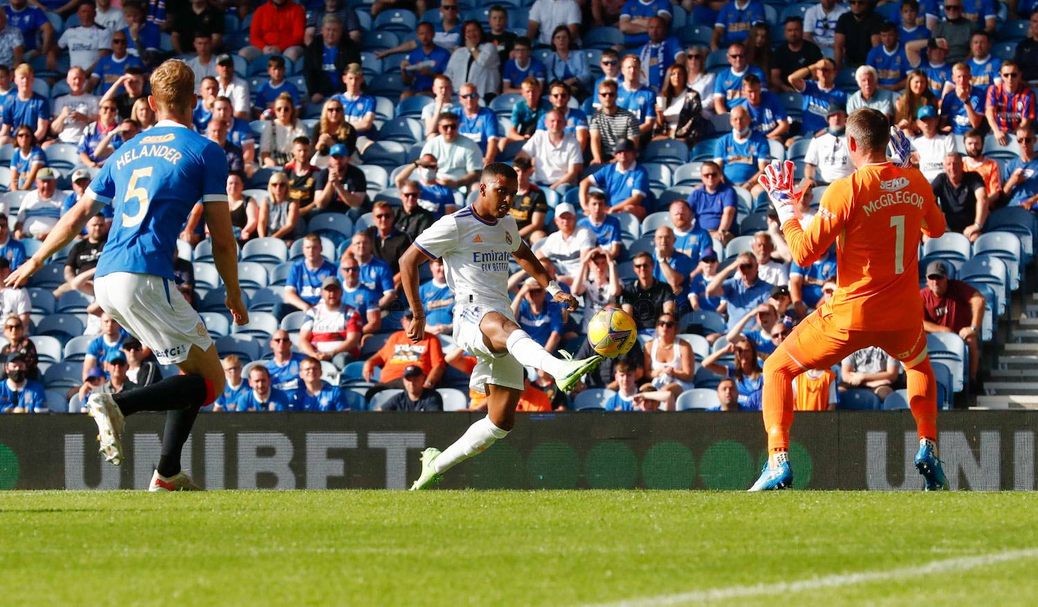 Desde el inicio se notó que la preparación física de los escoceses era muy superior a la de los nuestros ya que el Rangers lleva disputados varios partidos de pretemporada. A los nuestros se les vio carentes de ritmo y aún así lograban ponerse en ventaja en el minuto 8 tras un balón que corta Odegaard en propio área y sale como una flecha al área contraria en donde ve llegar a Rodrygo y le entrega el esférico, el brasileño regatea, se ayuda de un rebote y con calidad bate a McGregor. Pero solo iba a ser un espejismo.