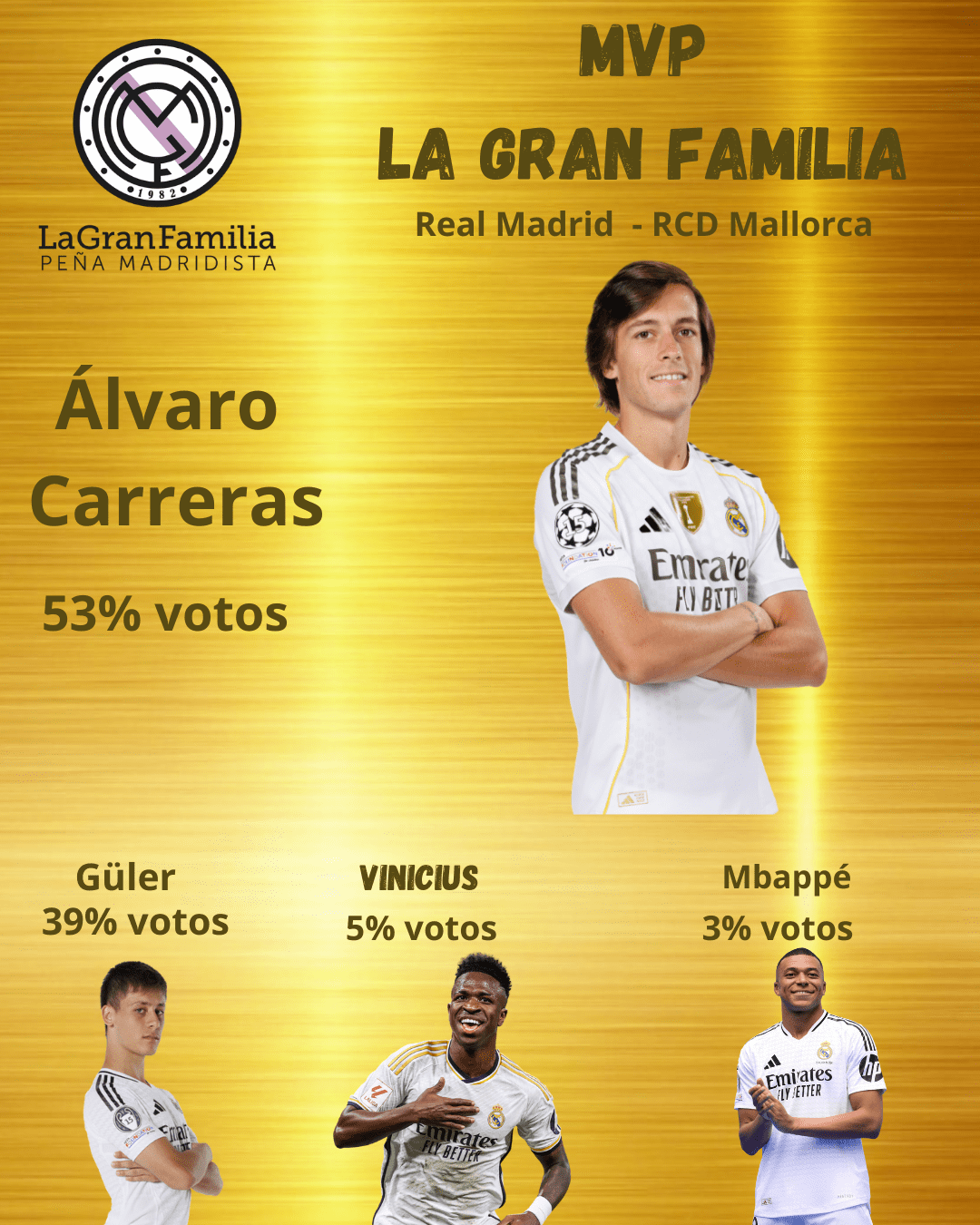 Muy buen partido de los nuestros en el Ciudad de Valencia, con una primera mitad en dónde fue muy superior, un arranque de segunda en dónde empezó al relenti y en la que el gol del Levante despertó a la bestia, Mbappé, qué con un doblete mató el partido. Fueron muchos los madridistas destacados, y a muchos os extrañaría que no incluyéramos a Kylian entre los cuatro mejores. Pero el francés ha arrasado en cuatro de las cinco primeras votaciones, y hemos querido dar oportunidad a otros compañeros. Por ello tras el partido os dimos la opción de elegir entre Mastantuono, Güler, Carreras y Vinicius para el MVP madridista, siendo Álvaro Carreras el elegido por vosotros con un 67% de los votos, seguido por Vinicius 27%, Mastantuono 4% y Güler 2%.