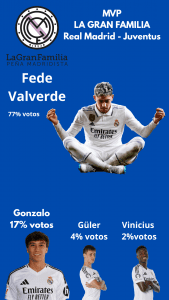 Tras una gran primera parte de los nuestros, en la que fueron muy superiores al equipo alemán, en la segunda intentaron ahorrar energias y los jugadores del Dortmund se nos subieron a las barbas en el tiempo añadido. Al final un apurado 3-2 que nos coloca en semifinales, en dónde nos espera el vigente campeón de Europa. Tras el partido os dimos a elegir entre Güler, Valverde, Fran García y Tchouaméni para el MVP merengue, siendo el lateral madrileño con un 85% de los votos el ganador, seguido de Güler 7%, Tchouaméni 5% y Valverde 3%.
