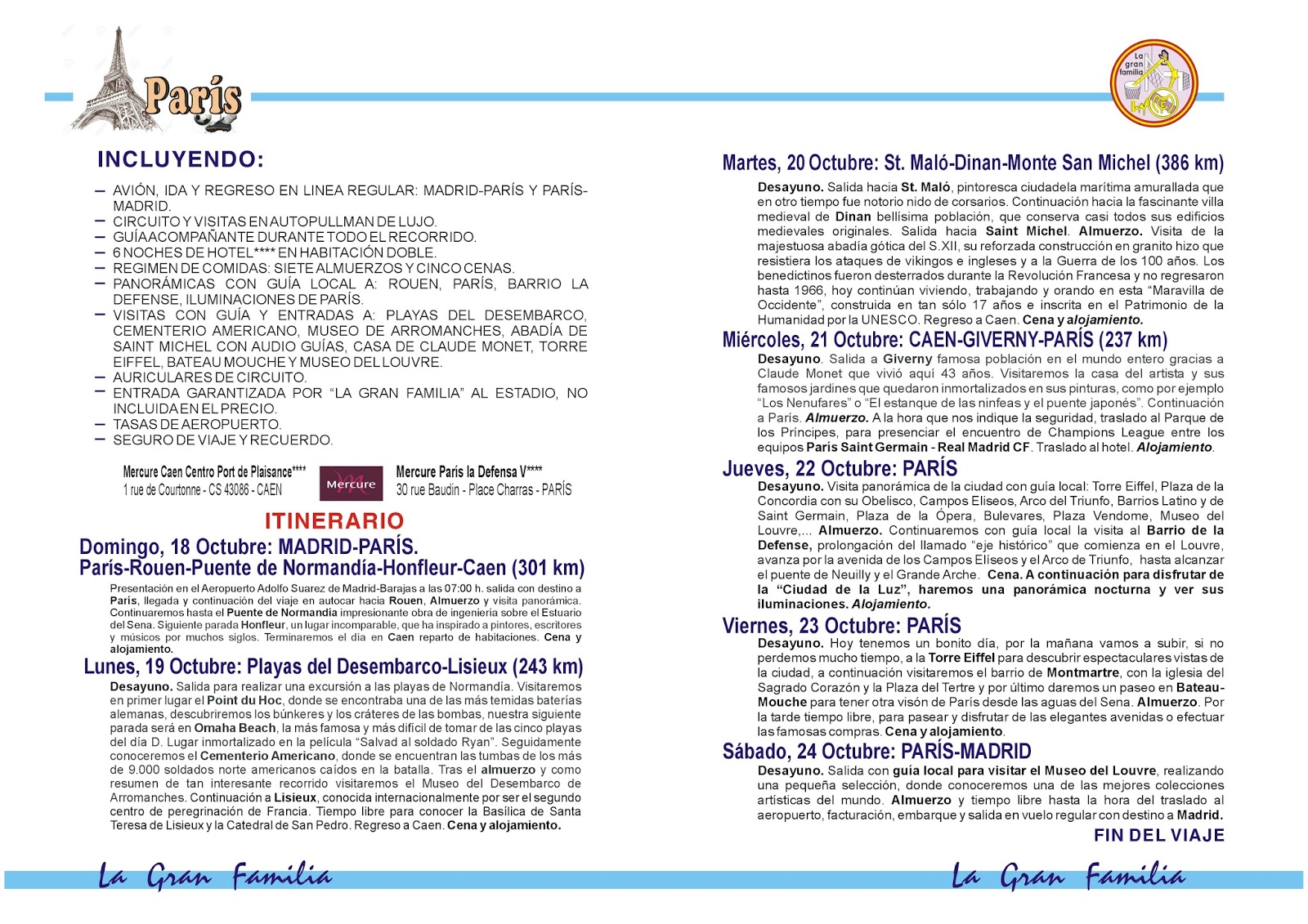 El viaje nos ha salido muy cómodo solo dormimos en dos hoteles utilizando Caen y París como ciudad dormitorio y desde aquí tenemos la gran posibilidad de hacer visitas maravillosas, además hemos incluido todas las entradas a los monumentos, los guías y todas las comidas, solo os tenéis que comprar el «bocata» para el fútbol, que esa noche no llegamos a cenar.