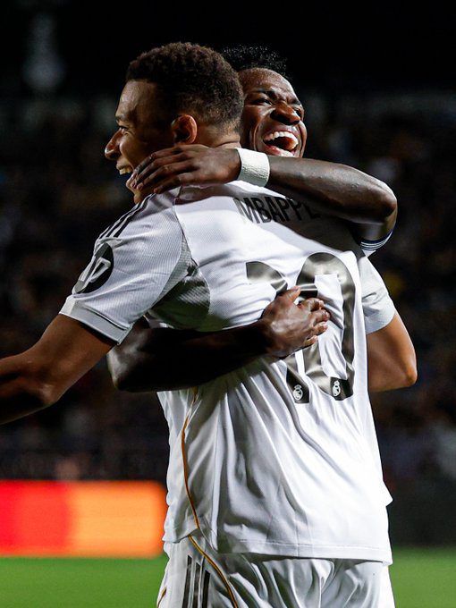“Imagen. Hat trick de Mbappé, que en la imagen se abraza a Vinicius. Fotografía Realmadrid.com.”