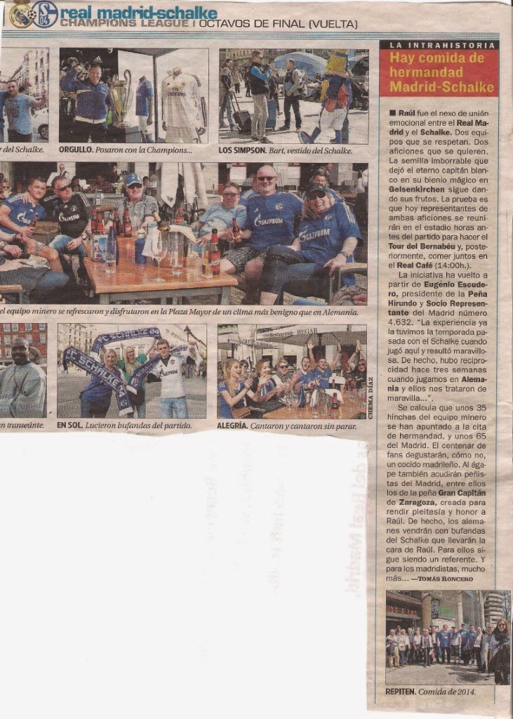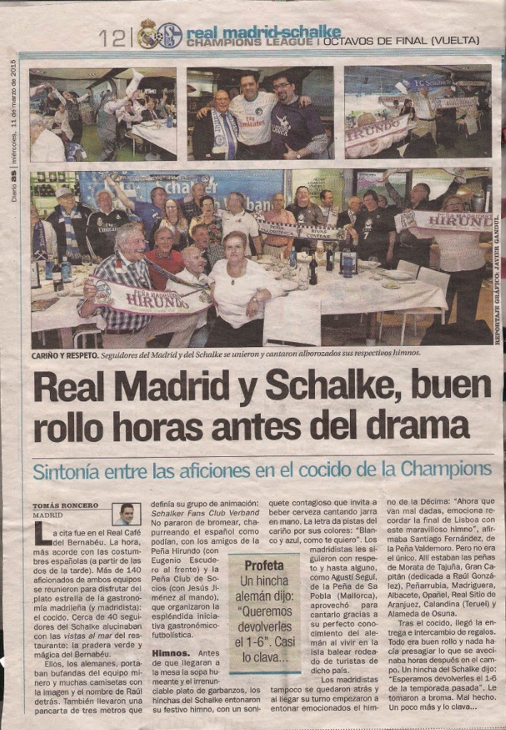 Adjuntamos fotocopias de la difusión del evento en el diario AS, tanto el día antes de la comida como el día después de la misma, de nuestro consocio y amigo Tomas Roncero, al que damos las gracias, ya que en su diario deportivo se dio a conocer la celebración de esta comida de hermandad con los Fan del Schalke 04, que también fue difundida por otros medios de comunicación.
