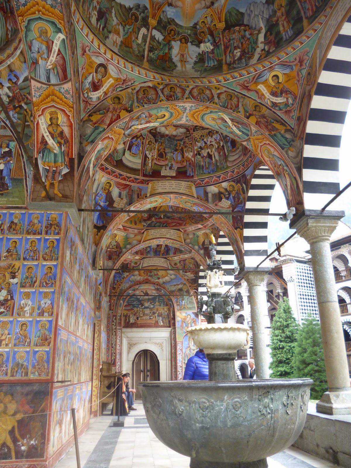 Tras 120 km. parte por autopista y parte por pequeñas carreteras, llegamos al Monasterio, a la entrada, por si no podíamos dentro, foto de grupo con la pancarta pequeña. Si el aperitivo está fuera, cuando pasas las puertas de entrada ¡impresionante! nadie se podía imaginar lo que había dentro, un gran patio con el templo ortodoxo de la Natividad en el centro y edificios alrededor con escaleras y corredores que van dando acceso a las celdas. Es una auténtica fortaleza que simboliza el sentimiento de identidad de Bulgaria, después de siglos de ocupación del Imperio Otomano. En una de las partes laterales han creado el Museo del Tesoro: libros manuscritos, antes de la imprenta; trajes de los sacerdotes de los últimos siglos; cálices de plata y oro; iconos y piezas originales del monasterio como sus puertas. Pero la obra más importante, una cruz en madera de 80 cm. de alto, por 40 de ancho, que un monje llamado Rafael realizó durante 12 años, más de un centenar de escenas de la Biblia con 600 figuras humanas y animales y un detallismo realmente asombroso hace que tamaños similares a una cabeza de cerilla, llegan a transmitir una tremenda expresividad.