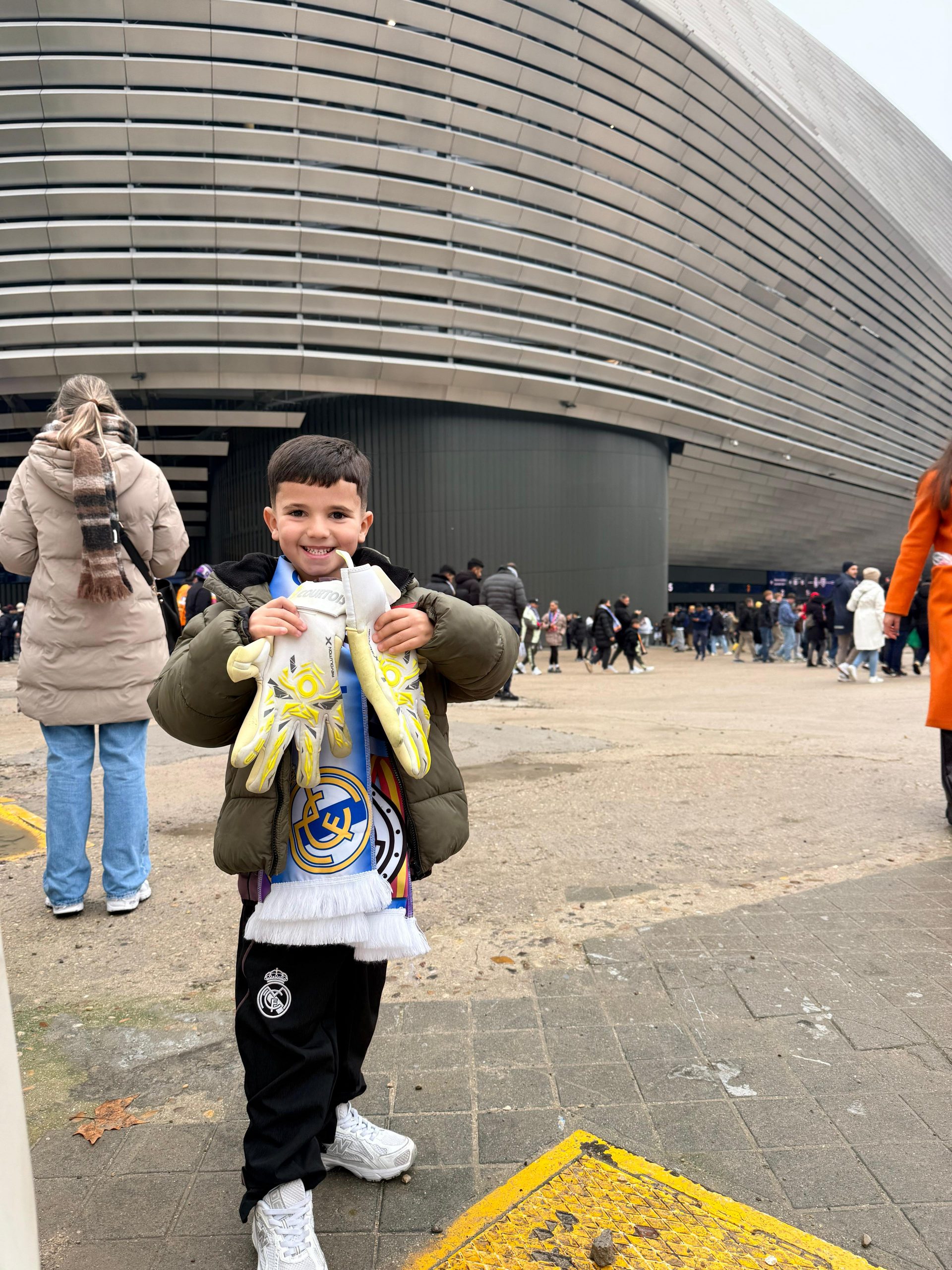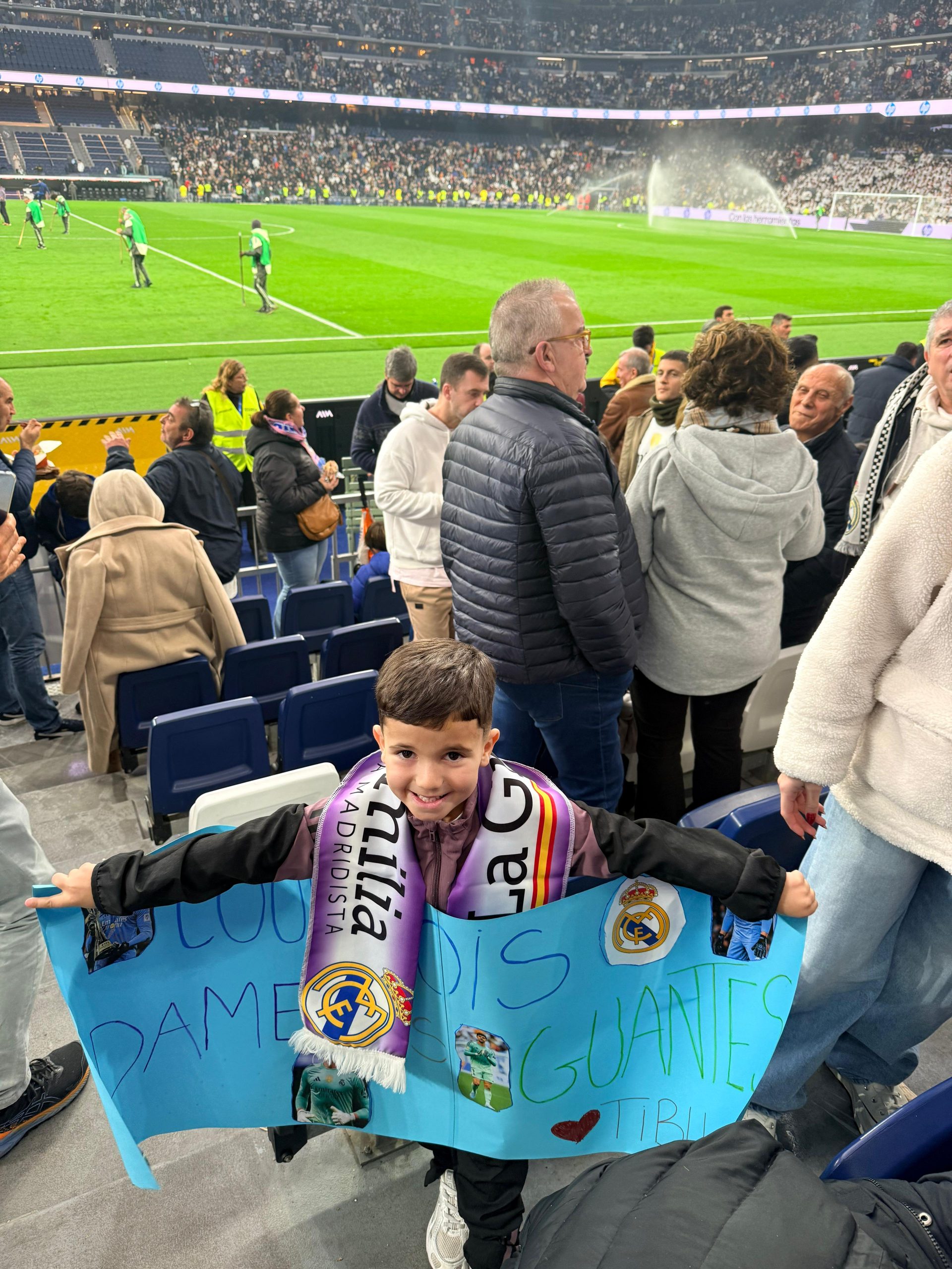 Hola mi nombre es Darío tengo 6 años y soy de Granada, este es mi primer año de futbol y me encanta ser portero. Juego actualmente en la escuela del Granada Cf Prebenjamín, me encanta el futbol y mi equipo es el Real Madrid, por eso yo y mi padre nos hicimos socios de esta peña, La Gran Familia, y en el partido ante el Rayo vallecano fue mi primera vez en el Bernabéu, me quedé impresionado al verlo en directo y al ver a mis ídolos. Como ya os cuento mi sueño es ser portero y por ello entreno incansablemente y como no podía ser menos mi mayor ídolo es Thibaut Courtois, por eso con la ayuda de mis padres y mi hermano pequeño hice esta pancarta para pedirle sus guantes, nunca me imaginé que esto se haría realidad, pero como mis papás siempres me dicen a veces los sueños se hacen realidad, no puedo contaros con hechos lo que sentí en ese momento, pero es una mezcla de nervios alegría y felicidad que raramente se volverá a repetir, comparto con vosotros esta experiencia y espero volver pronto al Bernabéu.