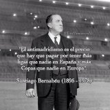 Pero jamás leí un libro de texto donde apareciera el nombre de Santiago Bernabéu. Más aún había profesores que no hablaban bien de él, porque no les gustaba el deporte y todo el tiempo libre lo dedicábamos a fútbol o porque aún gustándoles el deporte decían que no había dinero para otros deportes y todo se lo llevaba el fútbol. Recordar que en aquella época, de los Presupuestos del Estado no se daba nada al deporte, todo se sacaba de las quinielas donde había que acertar los partidos de fútbol.
