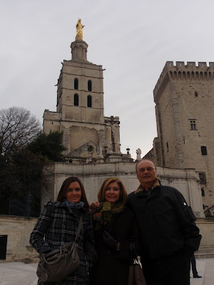 | Manolo y Rosa junto a su hija en Avignon o Aviñón, con el Palacio de los Papas detrás. Viaje Olympique de Marsella – Real Madrid. 2009-10 |