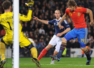 Tercer partido de la fase de clasificación para la Eurocopa del 2012, y tercera victoria de nuestra selección. Aunque el resultado ajustado haga parecer que resulto muy complicado, la verdad es que durante casi todo el encuentro la superioridad de los españoles fue total. Quitando los primeros cinco minutos que los escoceses salieron apretando, la primera mitad fue totalmente del conjunto español. Los escoceses totalmente metidos en su mitad de terreno de juego, dejando a Miller, solo en el ataque. Los jugadores españoles, tocaban y tocaban, pero les costaba romper la maraña defensiva de los escoceses. Y cuando parecía que con el 0-0 inicial se marcharían los dos equipos a los vestuarios, llegaron unas manos de Whittaker dentro del área local, señalando el arbitro el consiguiente penalti. Villa ejecutaba la pena máxima y ponía por delante a nuestra selección, a la vez que acababa con la racha de varios partidos sin marcar e igualaba la marca de Raúl como máximo goleador histórico de nuestra selección. A los 10 minutos de reanudado el partido, Iniesta ponía el 0-2 en el marcador, y por el juego que estaba desarrollando España, y por el resultado a favor, parecía que todo estaba finiquitado. Pero la selección se relajo en el aspecto defensivo, y en menos de diez minutos los escoceses empataban el choque. Primero en el minuto 58, cuando tras un centro al corazón del área y despiste de nuestros centrales, Naismith remataba de cabeza completamente solo, y establecía el 1-2. El empate, llegaría en el minuto 66, cuando tras un centro lateral al área española, Piqué, al intentar evitar que el balón llegase a los delanteros escoceses, introducía el balón en la portería defendida por Iker. Escocia, sin haber hecho meritos para ello, se encontraba con un empate totalmente inmerecido. Pero nuestra selección es difícil de doblegar. Tanto en el aspecto de juego, como en el anímico, esta selección nuestra es muy fuerte. En el minuto 79, cuando apenas llevaba cuatro minutos en el terreno de juego, Llorente remachaba al fondo de la portería escocesa un excelente pase de Capdevila. Al final, el resultado hacia justicia en favor de una selección que había hecho todo para llevarse la victoria.