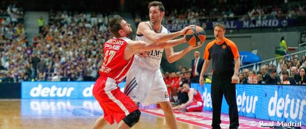 El Madrid cobra ventaja en el play off de cuartos de final de la Euroliga después de una contundente victoria ante el actual campeón, el Olympiacos griego. Rudy Fernández, con 20 puntos, 6 rebotes, 5 asistencias, 3 robos (34 de valoración) fue el mejor del partido, ayudado por un gran partido de Mirotic (15 puntos y 6 rebotes). Sergio Llull y Sergio Rodríguez aportaron 12 puntos cada uno, aunque no pudieron evitar que Vassilis Spanoulis anotara 18 puntos por parte visitante. El buenísimo jugador griego tuvo un segundo cuarto perfecto pero lastrado por las faltas y el cansancio acabó diluido como el resto de su equipo. El Real Madrid, muy serio y jugando con un gran ritmo durante casi todo el partido, se llevó la primera victoria del play off. El próximo jueves a las 19:00 horas el segundo partido, también en Madrid.