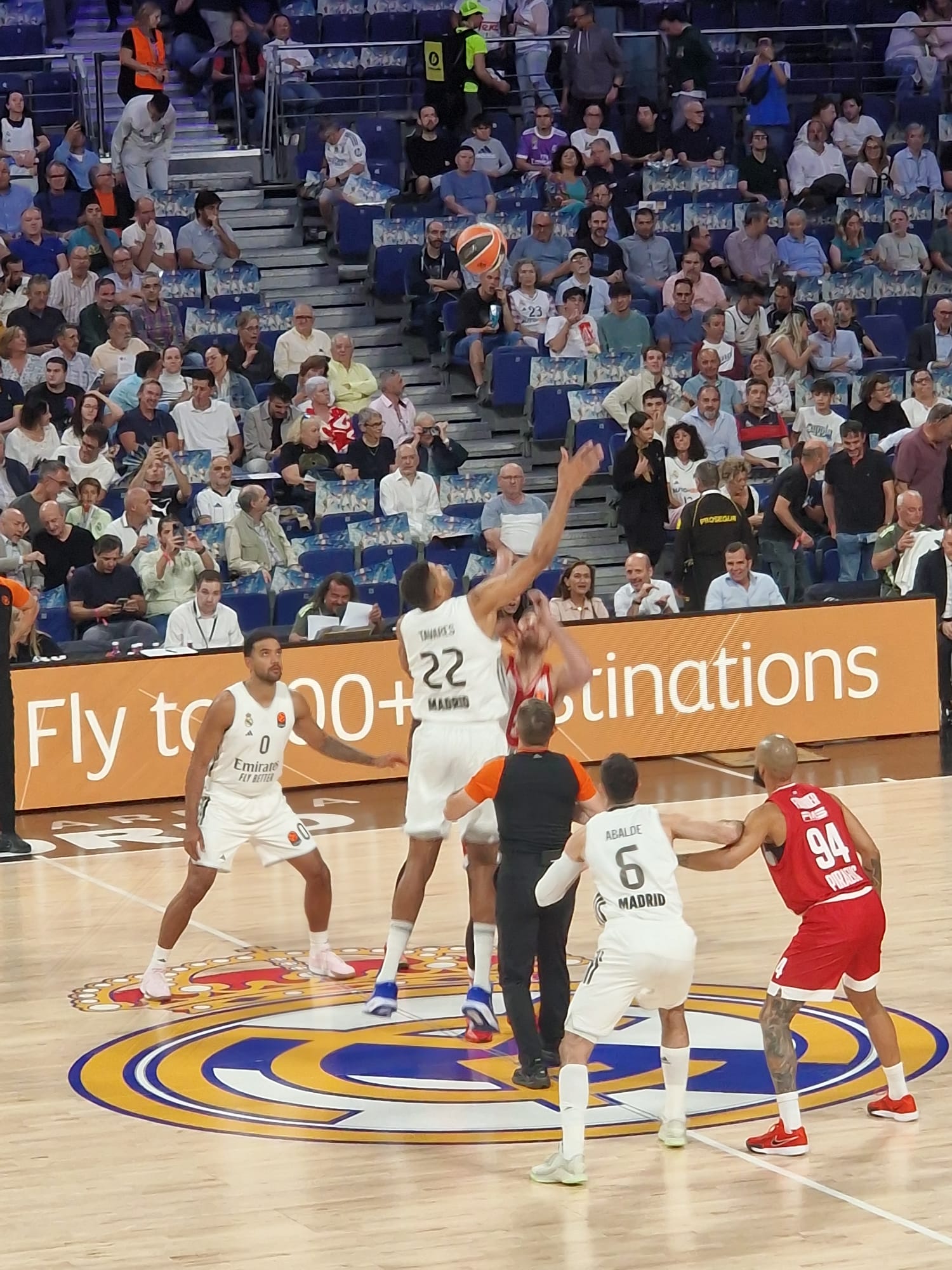 El baloncesto volvía al Palacio, aunque el inicio no fue el esperado, el Olympiacos salió enchufadísimo desde el perímetro, firmando un estratosférico 7 de 8 en triples. Tyler Dorsey se convirtió en una auténtica pesadilla para la defensa blanca con un perfecto 4 de 4 desde más allá de la línea de 3, anotando 16 puntos creando la inquietud entre el público. El Madrid no encontraban respuestas defensivas ante el festival ofensivo visitante. La diferencia al término del primer cuarto era de diez puntos (19-29), con un Madrid desconcertado que veía cómo su debut europeo en casa se tornaba en una tarde de tormenta. El único consuelo era que el encuentro acababa de empezar y había tiempo para reaccionar ante un rival que parecía intratable.