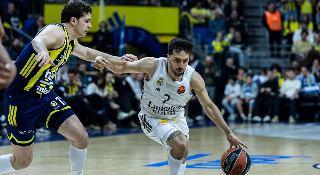 Imagen: Abalde tuvo que emplearse a fondo para parar a los exteriores del equipo turco. Fotografía cuenta oficial X RealMadrid de Baloncesto