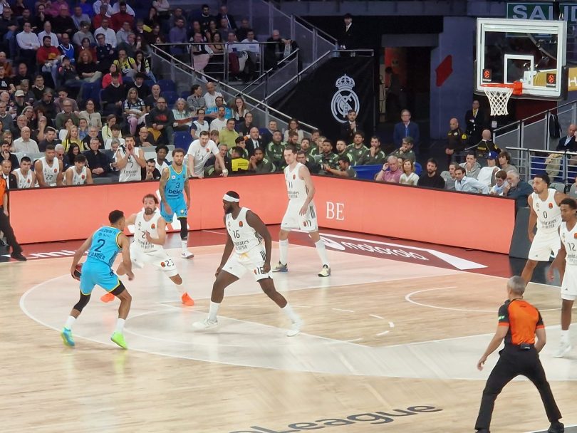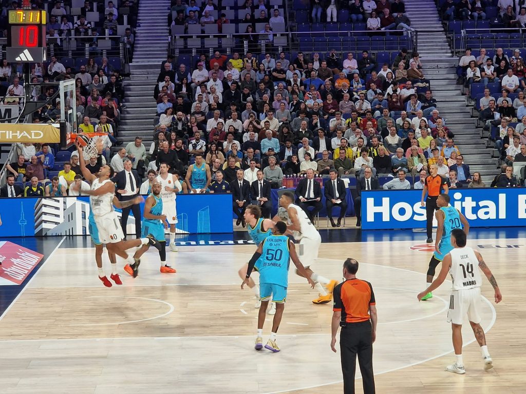 El Real Madrid salió con una hambre quizá picado por las dudas generadas por las derrotas fuera de casa, antes se había guardado un emotivo minuto de silencio en memoria de José Manuel Ochotorena exguardameta del Real Madrid de fútbol. El arranque fue demoledor desde el perímetro con primer parcial 12-2 en menos de tres minutos tras dos triples consecutivos de Facu y otro de Trey Lyles acompañando un 2+1 previo de Tavares que dejó claro desde el primer segundo que esta noche no habría piedad para el vigente campeón de Europa, bajo la atenta mirada desde el banquillo de Alex Len recién fichado y de Chuma Okeke lesionado con un esguince en el tobillo. Todo parecía sencillo con el acierto desde el 6:75, Alberto Abalde añadió otro triple desde larga distancia forzando un tiempo muerto temprano de Sarunas Jasikevicius cuando el marcador ya reflejaba un inquietante 17-2 que auguraba una noche larga para los turcos, la rotación de Théo Maledon y Andrés Feliz que hacía su reaparición tras lesión mantuvo la intensidad defensiva junto a los titulares Deck y Lyles mientras “Chiquitín” cerraba el rebote en ambos aros con su intimidación característica. Pequeña reacción visitante gracias a tres triples consecutivos dos de ellos de Talen Horton Tucker que frenaron momentáneamente la hemorragia, “Super Mario” entro en escena para frenar la reacción con un triple lejano y con defensor encima permitiendo a los de blanco irse con una ventaja cómoda al final del primer acto, parcial 25-16.