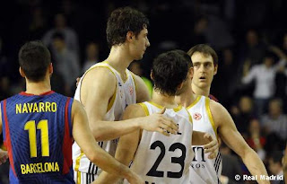 si dije que en el primer partido perdimos una gran ocasión para derrotar al Barça, en este segundo, la oportunidad no se dejo escapar. Me da la sensación, que en Barcelona no esperaban a este Real Madrid, acostumbrados ellos a sobarnos bien los morros últimamente. Si en gran parte del primer choque, los madridistas fueron dominadores del mismo, ayer, el Madrid fue superior en juego a su rival. Empezó fuerte el Madrid y logro imponerse en el primer cuarto por 8-15, lo cual dio mucha moral a los jugadores blancos para el resto del encuentro, e hizo pensar a los azulgranas en que el partido no iba a ser fácil. Messina, gran entrenador y gran estratega, preparo un partido incomodo a las figuras barcelonistas. El Madrid se mostró muy firme en defensa en todo el choque, como lo demuestran los solo 8 puntos que anotaron los blaugranas en el primer cuarto. En el segundo cuarto, reaccionaron los barcelonistas, Pascual movió su banquillo y logro motivar a su equipo, que llego a ponerse en ventaja (22-19). Pero los jugadores del Madrid no estaban por la labor de perder de nuevo una gran oportunidad de derrotar al Barcelona. El segundo acto de la primera mitad, acabo con un parcial para los cules de 19-17, pero seguía dominando el equipo blanco en el global de la primera mitad. En el primer cuarto de la segunda mitad los hombres de Pascual salieron apretando, pero el Madrid mantuvo el tipo, y gracias a la gran actuación durante todo el choque de Tomic, el Madrid se impuso en esta fase del partido por 13-19. Se llegaba al ultimo cuarto con un 10 puntos de ventaja para los madridistas. Si en el primer encuentro, el Madrid tiro el choque en el ultimo cuarto, ayer no estaban por la labor y plantaron pelea a los azulgranas hasta el final del choque. Al final de estos últimos 10 minutos se llego con ventaja azulgrana de 23-20 que daba el global de ese 63-70 con el que termino el partido. Tomic, con 22 puntos y 26 de valoración, fue el mejor hombre de los madridistas y también del partido.