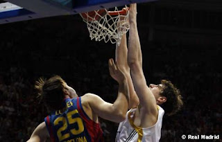 Si en los dos anteriores partidos el Madrid fue superior en juego a los blaugranas, ayer y gracias a una gran actuación de Navarro, el cual, en los dos partidos anteriores no estuvo a su nivel habitual. El conjunto blanco se encontró enfrente un Barça más parecido al que últimamente le ha pintado la cara en varias ocasiones, sobre todo en la primera mitad. Los azulgranas se distanciaron pronto en el marcador, poco a poco fue poniendo como una losa a los jugadores madridistas. Al final del primer cuarto el resultado era de 14 a 25 a favor de los jugadores dirigidos por Pascual. La segunda parte del primer acto fue muy similar al primero. El Barça de la mano de un excelente Navarro, imponía su juego y se imponía en el marcador. 17-21 fue el parcial del segundo cuarto.