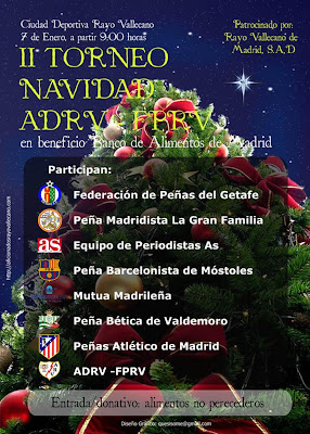 El II Torneo Benéfico de Navidad en favor del Banco de Alimentos de Madrid, tendrá lugar el sábado día 7 de enero desde las 9:00 horas a las 15:00 horas en las instalaciones de la Ciudad Deportiva del Rayo Vallecano, con la participación de la Federación de Peñas del Getafe, Equipo de Periodistas del As, Peña Barcelonista de Móstoles, Mutua Madrileña, Peña Bética de Valdemoro, Peñas del Atlético de Madrid, ADRV-FPRV (Rayo Vallecano) y Peña Madridista La Gran Familia (es decir, nosotros).