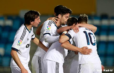 | Los jugadores castillistas celebrando uno de los goles al Mirandés. Fotografía realmadrid.com |