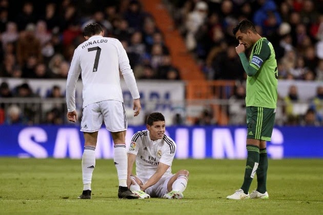 | James se queja de su pierna derecha ante Cristiano y un rival. fotografía marca.com |