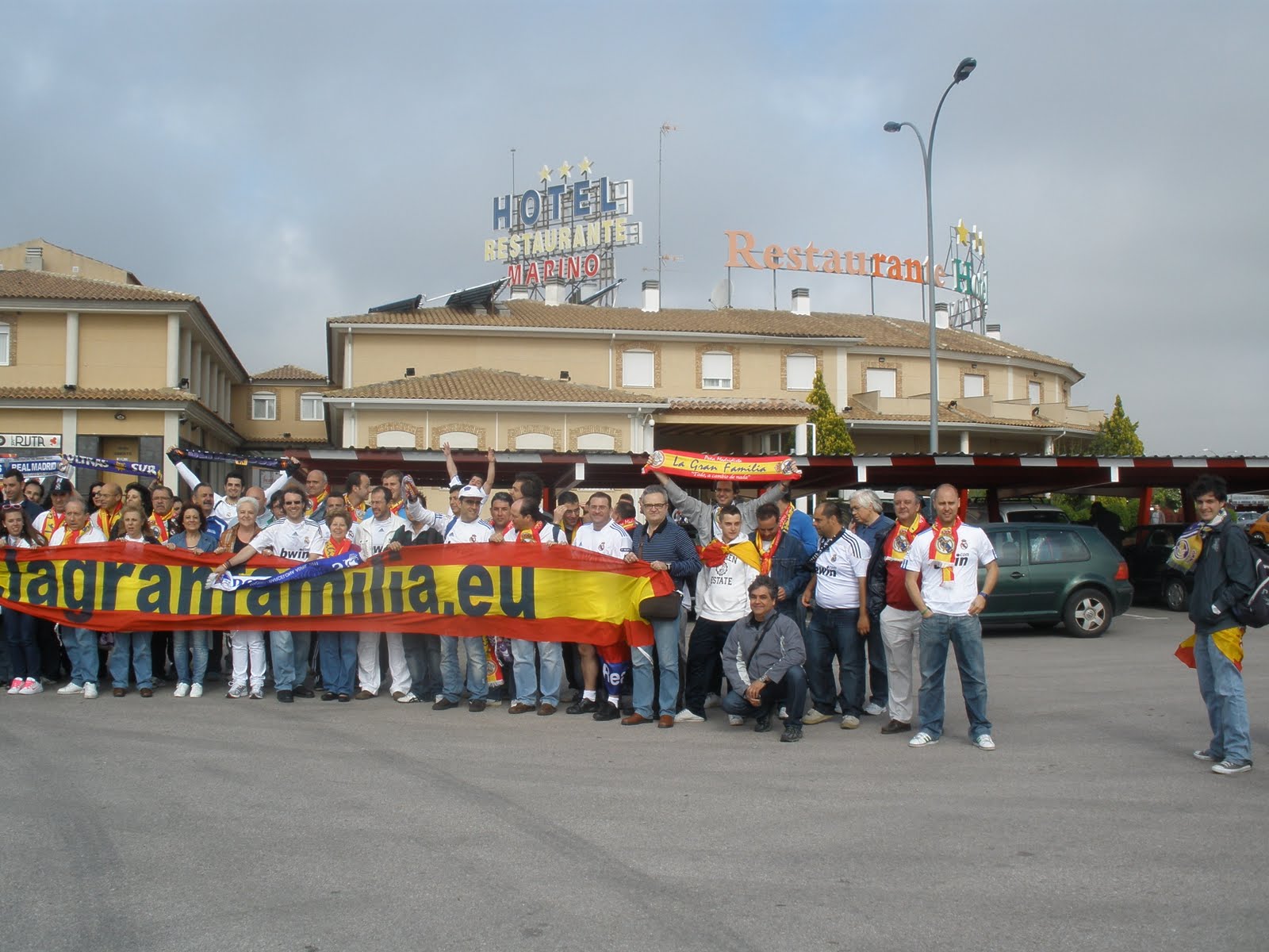 En estas dos fotos podéis ver al grupo de seguidores que viajo con nuestra Peña a la final de Copa en Valencia. Las fotos están realizadas en la parada que hicimos cerca de Honrubia, en el restaurante Casa Marino.