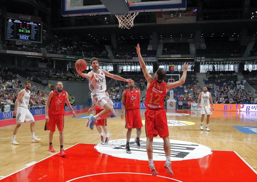 Rudy Fernández (30 puntos, 7 rebotes y 5 asistencias para 40 de valoración) se echó el equipo a la espalda para vencer a un correoso CAI Zaragoza que llevó las riendas del partido durante gran parte del tiempo. En un mal partido de Mirotic y Bourousis, el menorquín, junto con el buen trabajo de Darden y Mejri, dio la victoria al Madrid para mantenerse líder una jornada más. Sanikidze, con 11 puntos y 19 de valoración, Jones, Tabu y Tomás, los más destacados por el CAI.