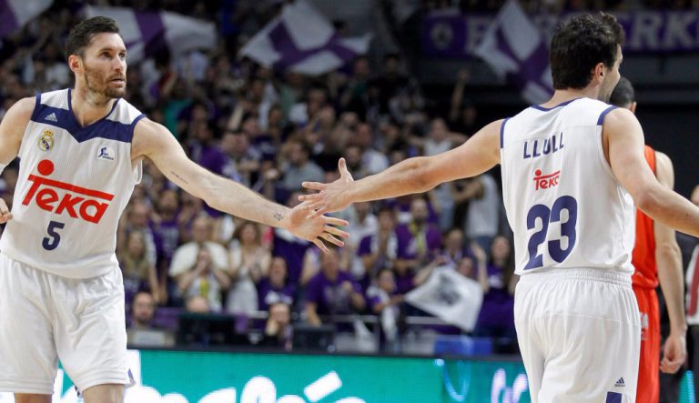 “En la imagen, Rudy y Llull se saludan tras un lance del partido. Fotografía Solobasket.com”