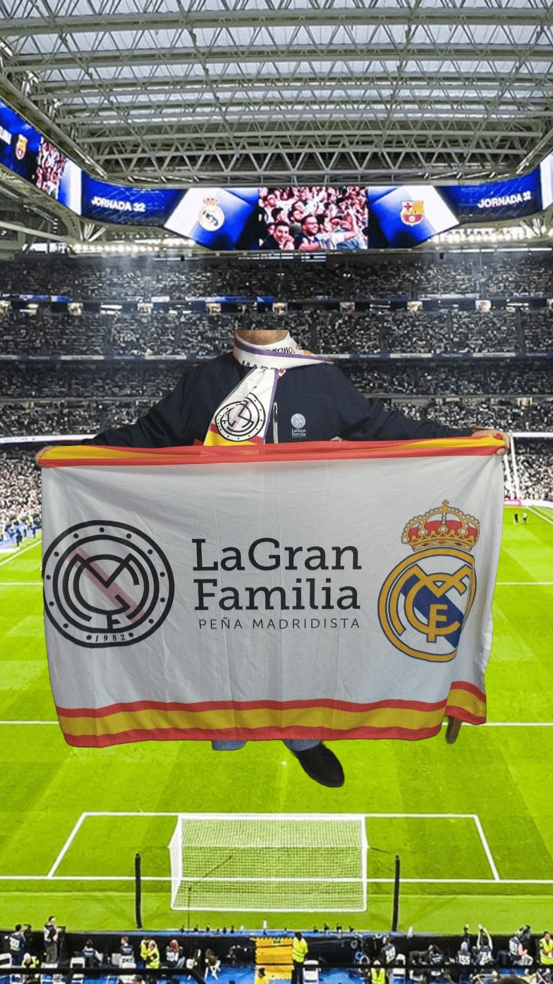 Escudos del Real Madrid y La Gran Familia a ambos lados, con el nombre de la Peña en el centro. Medidas 1’80 x 1’00.