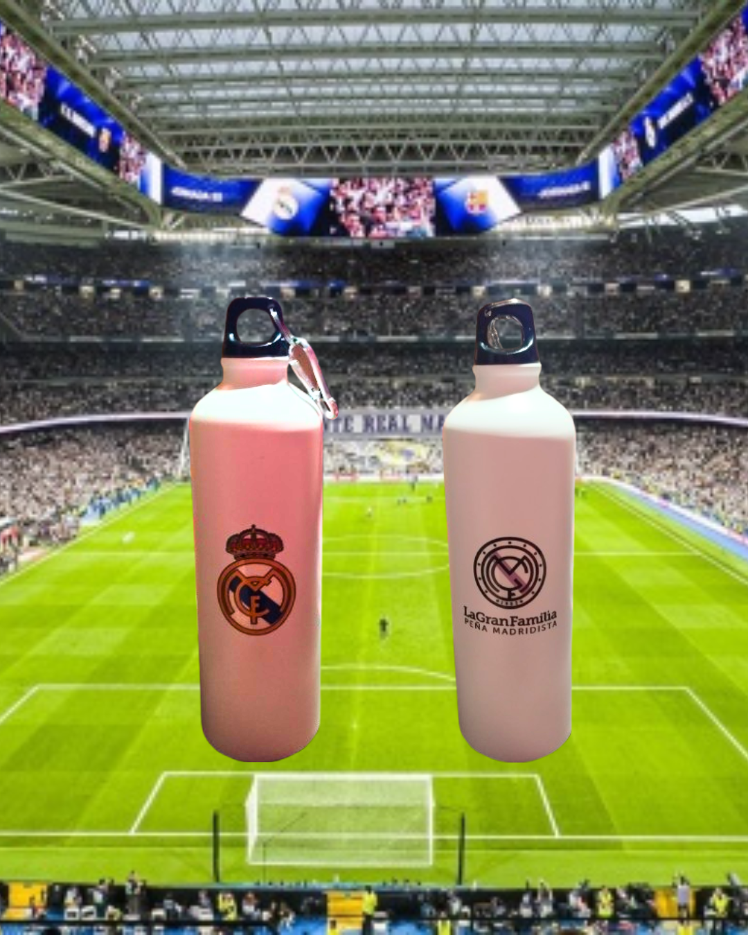 Bidón de aluminio de 500 ml. dé color blanco, con los escudos de La Gran Familia y de nuestro Real Madrid.