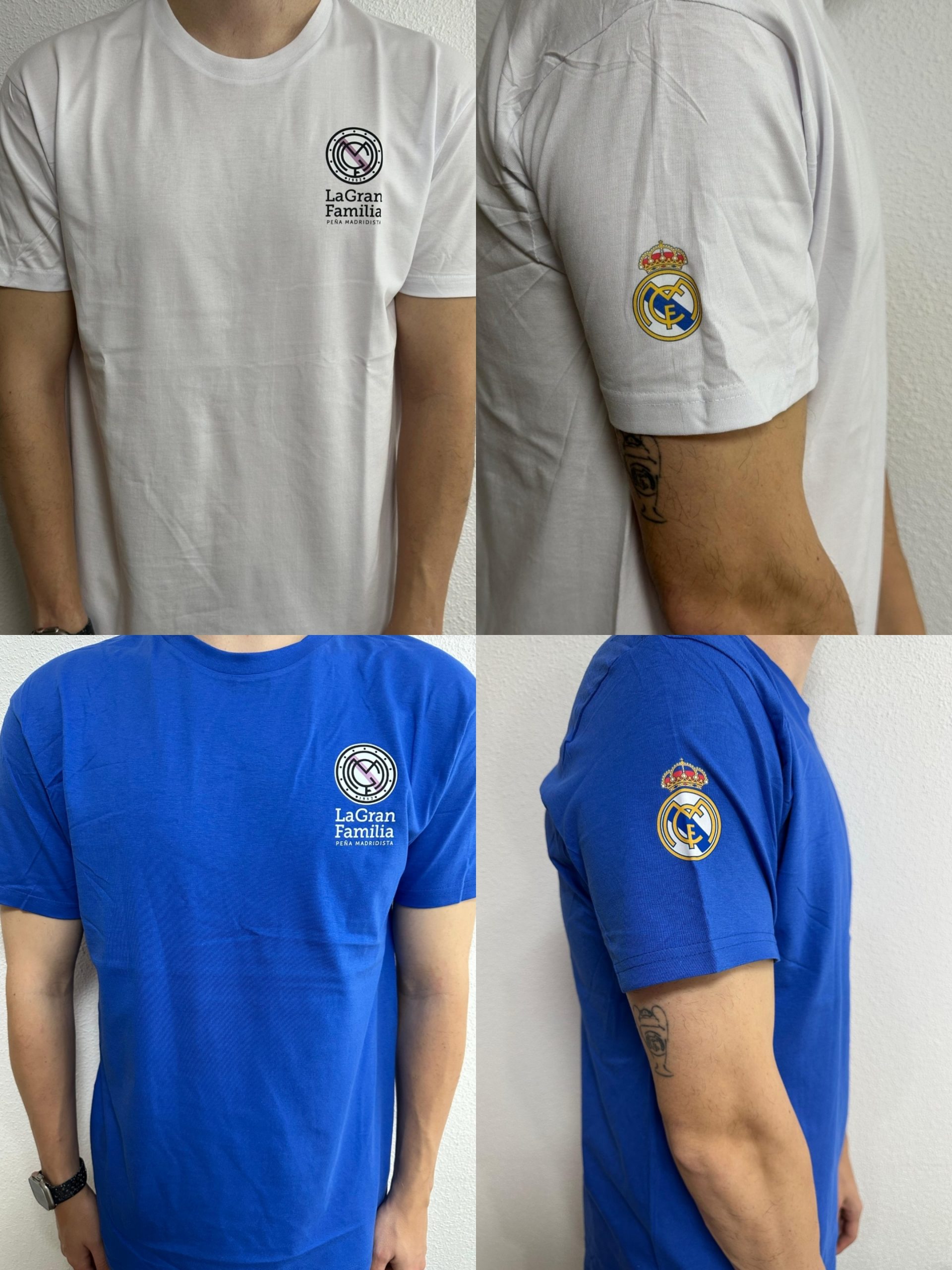 Camiseta de algodón con escudo de la peña en el pecho y el del Real Madrid en manga.