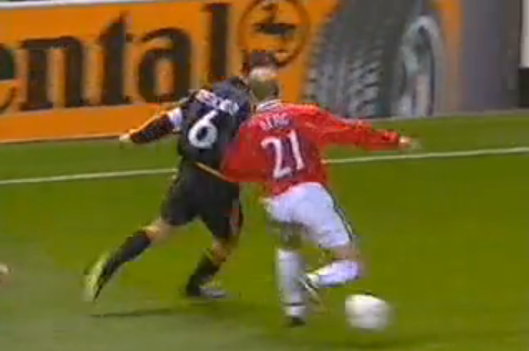 El primer partido lo jugaríamos en casa, y sería vibrante, como corresponde a un enfrentamiento entre dos grandes equipos. El partido terminaría sin goles, pero el Madrid dispuso de varias ocasiones para batir al meta Bosnich. El miércoles 19 de abril, el Madrid visitaba un enfervorecido Old Trafford y realizaba uno de los mejores partidos que se le recuerdan en competición europea. Los madridistas derrotaban al vigente campeón de Europa por 2-3, llegando a ser el resultado de 0-3 en el minuto 53 de partido. Roy Keane en propia puerta y un doblete de Raúl serian los tantos de los madridistas, pero para el recuerdo quedará el taconazo de Fernando Redondo. El argentino recibió un balón de McManamam y con una elegancia enorme se hace un autopase de tacón ante Berg al que deja clavado, acelera para llegar hasta la linea de fondo, levantar la cabeza y ponerla para donde entra Raúl que casi solo tiene que empujarla al fondo de la portería. Una obra de arte. El Madrid casi contra pronostico se plantaba en las semifinales de la Champions.