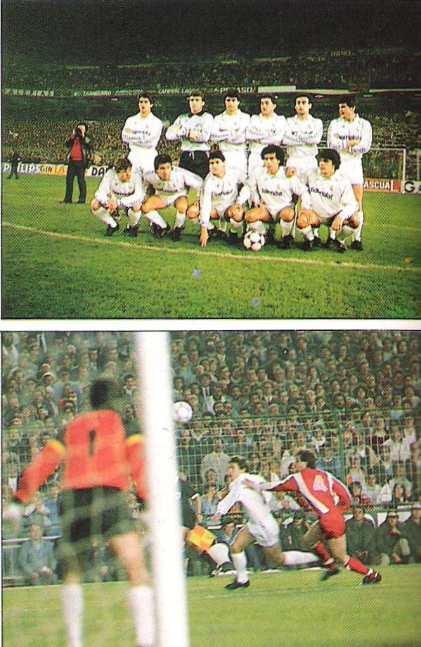 En la fotografía de arriba los jugadores saludando a la afición. En la de abajo, Sanchis rematando lo que seria el 2-0. Las fotografía pertenecen a la revista Real Madrid |