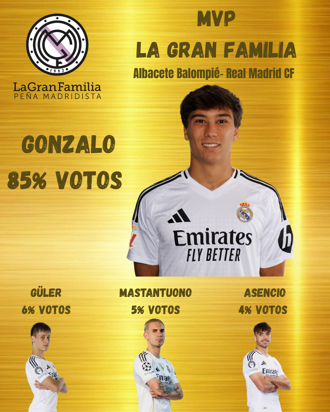 En partidos así y con la decepción en el cuerpo, es difícil en ocasiones salvar de la quema a cuatro jugadores para elegir el MVP del equipo. Ayer os dimos a elegir entre Asencio, Güler, Gonzalo y Mastantuono, siendo Gonzalo con un 85% de los votos el elegido, seguido de Güler 6%, Mastantuono 5% y Asensio 4%.