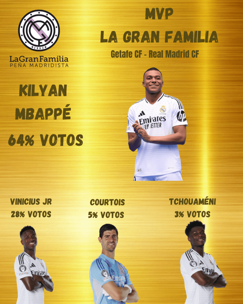 No es fácil doblegar al equipo azulón, y menos en su campo. Los nuestros se trabajaron la victoria a pico y pala para volver a la cabeza de la clasificación. Tras el partido os dimos la opción de elegir entre Mbappé, Vinicius, Tchouaméni y Courtois para el MVP madridista del partido, siendo una vez más El Tortuga el elegido por nuestros socios con un 64% de los votos, seguido de Vinicius 28%, Courtois 5% y Tchouaméni 3%.