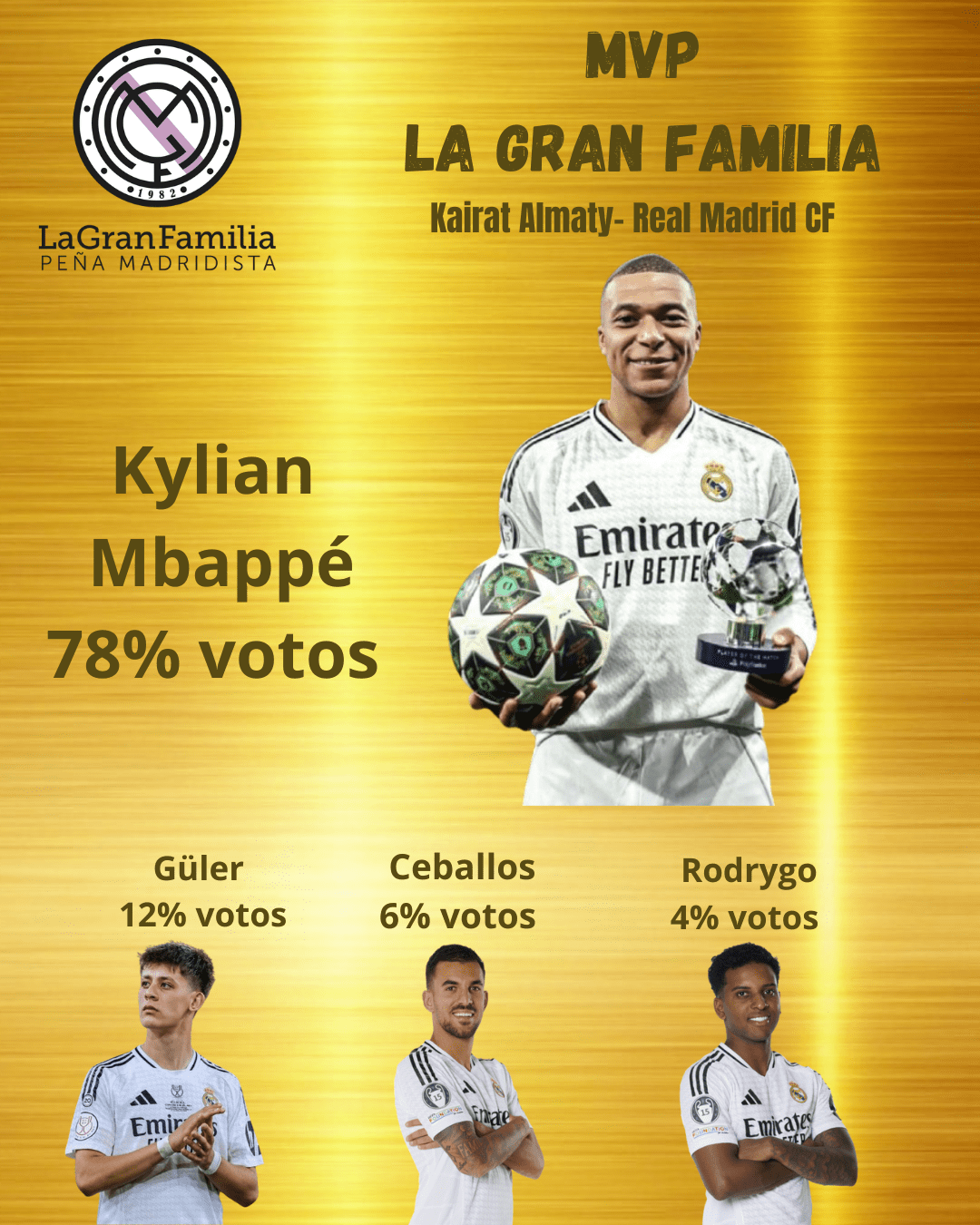 Segunda jornada de ésta Liga previa de la Champions 2025-2026. Era importante empezar con buen pie y no cometer los errores de la temporada pasada que nos condenaron a jugar el play off. De momento el equipo suma dos victorias en otros tantos partidos. Ayer gran partido y goleada ante el Kairat Almaty. Tras el partido os dimos la opción de elegir entre Ceballos, Mbappé, Güler y Rodrygo para el MVP merengue, siendo el elegido por nuestros socios Mbappé con 78% de los votos, seguido de Güler 12%, Ceballos 6% y Rodrygo 4%.