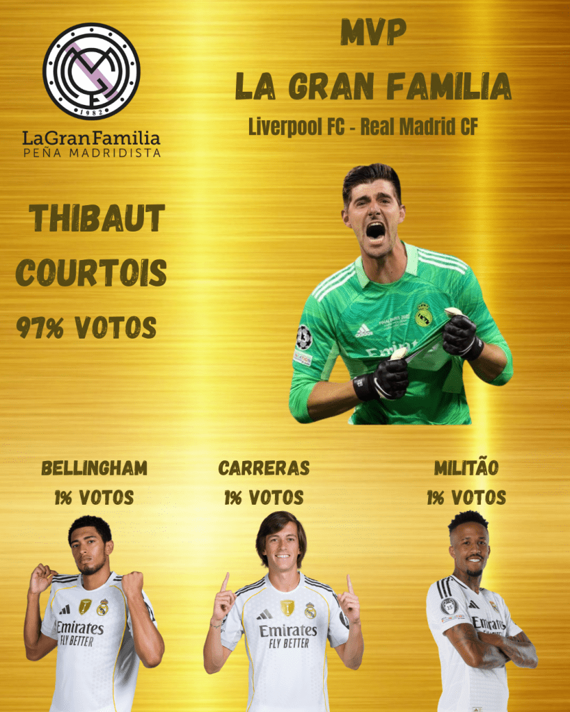 Por un gol a cero sucumbió el Madrid en Liverpool. No fue un partido horrible de los nuestros, pero le faltaron cosas para haber podido sacar algo positivo de su visita a Anfield. Tras el encuentro os dimos la opción de elegir entre Courtois, Militão, Carreras y Bellingham para el MVP madridista, siendo el guardameta con un 97% de los votos, seguido de Carreras, Bellingham y Militão, los tres con 1% de los votos.
